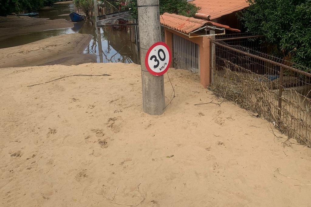 Após a enchente, as ruas da Ilha da Pintada, em Porto Alegre, ficaram cobertas de areia, evidenciando os estragos causados pela baixa do nível da água no Delta do Jacuí e no Guaíba. Com a altura da areia chegando a passar de um metro em alguns pontos, a dimensão do problema pode ser observada pelas placas de trânsito. A comunidade, que é a maior do bairro Arquipélago, enfrenta os impactos da inundação, demonstrando a necessidade de apoio e ações de recuperação.
